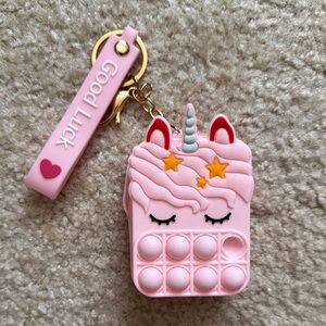 Colorful unicorn-themed Pop It shoulder bag set. Includes a unicorn head bag, a smaller unicorn bag, and a keychain. Perfect for kids.