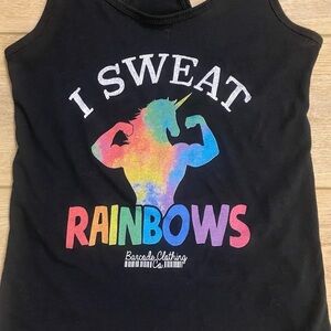 Black racer back gym tank by Barcode Clothing Co. features a flexing unicorn graphic “I Sweat Rainbows “ cheeky workout top. Perfect to stand out in the crowd during your Mud Run! In like new condition size Small.