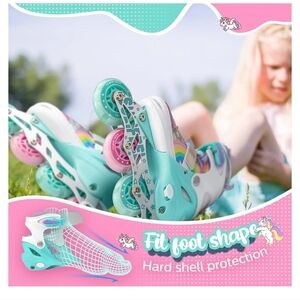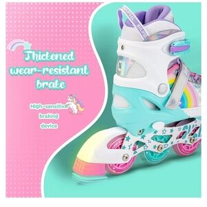 NEW IN BOX!Vibrant roller skates with light-up wheels. Features a rainbow design and adjustable straps. Perfect for fun skating adventures. NEVER WORN AND IN EXCELLENT CONDITION!!!