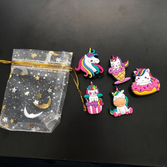 Unicorn Shoe Charms 5 Piece Variety Pack; Comes in a Moon & Stars Clear Sparkle Fabric Drawstring Bag; 1" Charms; New Open Box, No Tags; Excellent Condition; Plastic Bag had a hole in it, so I will transfer to these glitzy bags for FREE; See all photos for condition & descriptions; Ships Quickly, Monday - Friday (Except National Holidays). 4 oz. L101