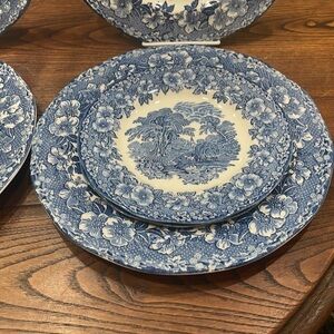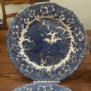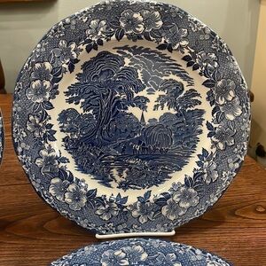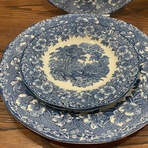 Unicorn Staffordshire England Ironstone Blue & White 4-Dinner & 4 Salad Plates—Beautiful pattern with hay wagon, farmer, trees and flowers. Beautiful!! Like new condition!