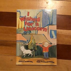 “I wished for a Unicorn” book. Pink unicorn toy takes 3 AAA batteries. Can push a button and walk on a leash. Unicorn shows some wear.