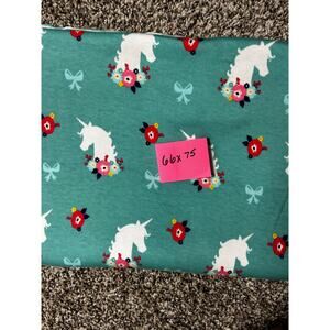 1. Dark turquoise fabric featuring unicorns, flowers and bows. Fabric measures 66"x75",