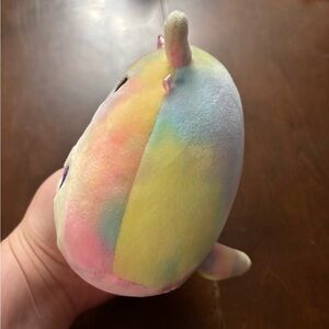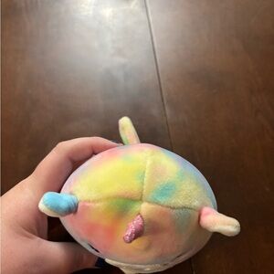 Adorable plush unicorn toy with a rainbow of colors. Features cute embroidered hearts.