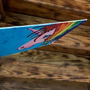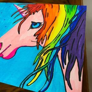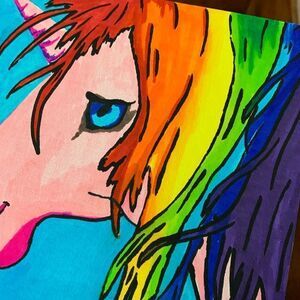Attention all unicorn lovers! Check out this beauty! Whimsical pink unicorn with rainbow hair! This is done in water color on an 8”x10” flat canvas. Can easily be framed! Signed by me.