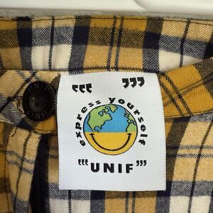 The Unif Dawson Yellow Plaid Pants in Womens size 24 are a stylish and versatile addition to any wardrobe. These high-waisted, cropped, straight-leg pants are made from comfortable cotton material and feature a vibrant yellow plaid pattern, perfect for casual or workwear occasions. With a slim fit and flat front design, these pants are trendy and on-trend, embodying themes of hipster, geek, grunge, and retro styles. The 26.5-inch inseam and cropped length make them a fashionable choice for the winter, fall, and spring seasons.