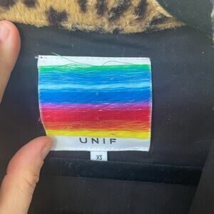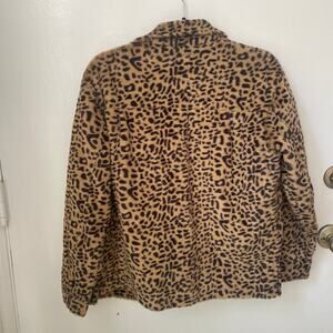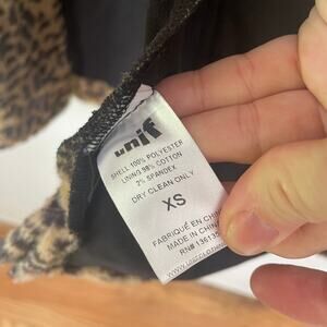 Faux-leopard coat with matte black branded snap button closure, two large front pockets, and a high low bottom hem with side slits. Jacket is unlined and has a between seasons midweight feel. Faux-fur is V soft. Slightly oversized fit, runs true to size.
