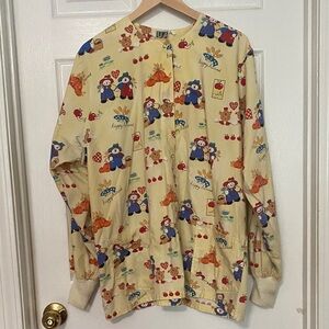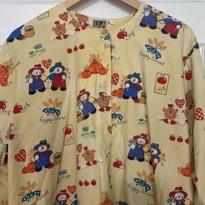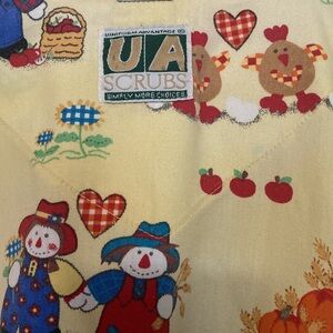 Charming scrub jacket with festive Fall Print. Features scarecrows, hearts, and apples. Perfect for a cheerful look.