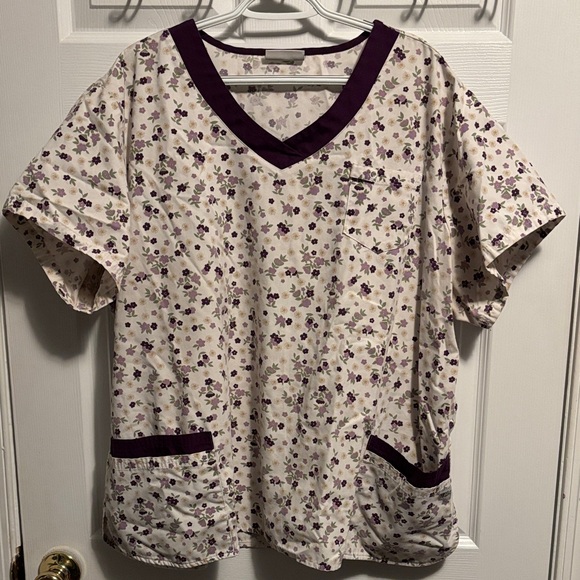 Uniform Advantage plus ditsy purple print scrub top. Multiple front pockets, functional chest pocket, and pleating on the back. Lightly worn with only flaw being some wear in armpit area! Size 3x. **is more white than cream**