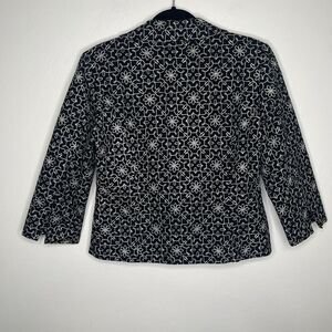 This product is a stylish black blazer made by John Paul Richard, featuring whimsical fairy floral designs embroidered on cotton outer shell - lining is made of polyester material. Designed in size 10 for women, this jacket from China adds a touch of unique flair to any outfit. Perfect for those looking for a special and eye-catching piece to wear or for collectors of specialty clothing items.