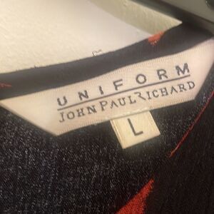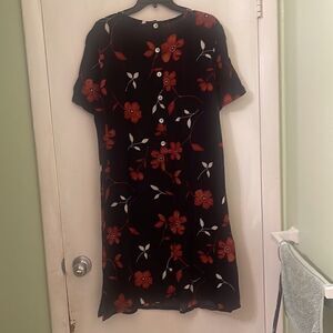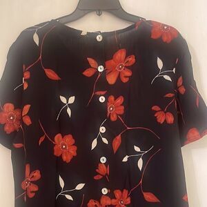 Black Background Rust White Floral Pattern 100% Rayon Short Sleeve 6 White Button Closure in Back Large