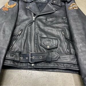 Authentic UNIK Leather Apparel motorcycle jacket with Harley-Davidson eagle patch and Daytona Beach Bike Week 2003 patch. Heavyweight black genuine leather with classic biker styling — perfect for riders, collectors, or vintage fashion fans.