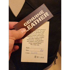 Unik's Genuine Leather Motorcycle Vest is new with tags and designed for men. The vest is black, size Large, offering style, comfort, and durability for motorcycle enthusiasts. It is sized for men, but works for men and women.
