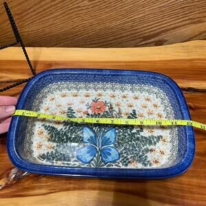 Unikat blue butterfly holly 10 inch baker from the ultimate bakeware collection, maker signed, handmade in Poland, 69-700 Boleslawiec.