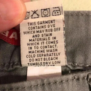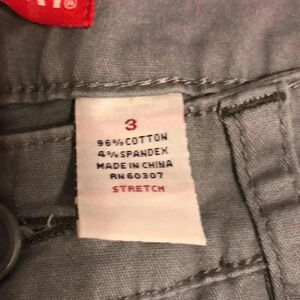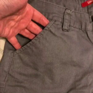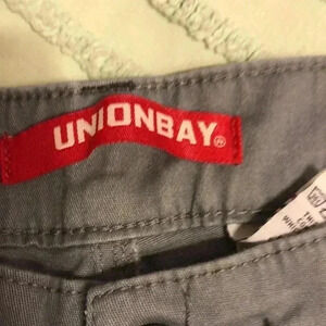 Union Bay shorts with side pockets and Velcro close back pockets. Cotton/spandex mix. Measurements are 13” waist and 8” inseam. Gray/green.