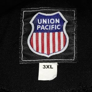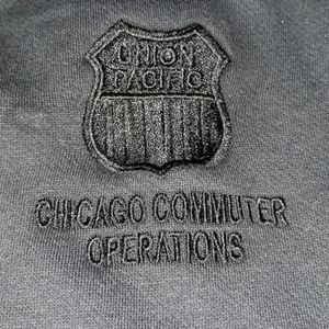 It's in excellent preowned condition. Its has a 1/4 zipper with fancy zipper pull, reinforced elbows, 2 pockets and no hood on this hoodless hoodie. On the front left chest is embroidered with the Union Pacific shield logo and Chicago Commuter Operations. Nice & fluffy inside. You can wear this while you sit at the crossing and watch the trains go by. Measures unstretched chest 64", length 32", underneath sleeve 23". Thanks for looking!