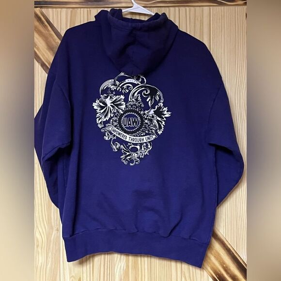 Beautiful regal purple hoodie has a drawstring, kangaroo pocket white and black graphic s on the back only.