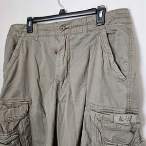 Comfortable and stylish tan / olive cargo shorts perfect for casual outings. Features multiple pockets for convenience. Zipper fly.