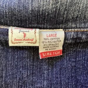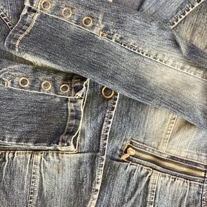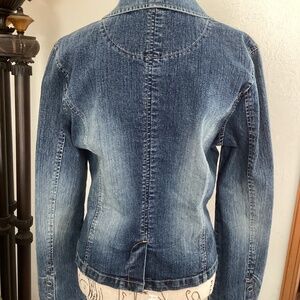 Super cute denim washed jean jacket with snap front closure, three snap close sleeves detail, functional zipper front pockets. Split gusset in the back. This is a taylored fit jacket with amazing detail. Super cute. Made by Unionbay Jeans. It has a nice stretch and flex to the denim.