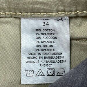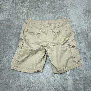 Men's tan cargo shorts with multiple pockets, button closure, and belt loops. Lightweight, durable cotton-spandex blend. Waist size 34, breathable fabric for everyday comfort.