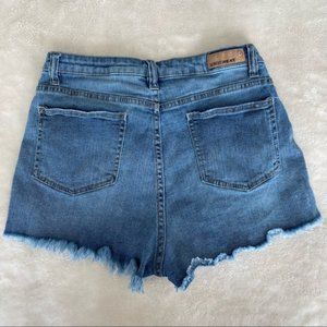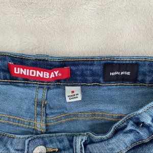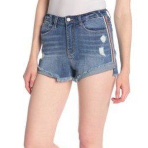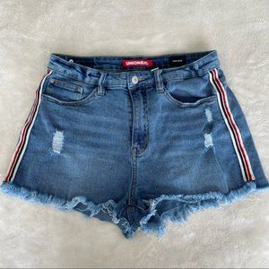 Gently worn Unionbay Roxie blue wash denim shorts. Distressed front with raw, cutoff hem. Red, white, and blue fabric stripes down each side for a fun, retro look. High rise. Super soft, worn in feel. Y2K vintage vibes. 5 pocket styling with zipper/button closure. Cotton/spandex blend for added comfort and stretch.