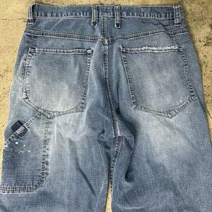 Unionbay Flex Jeans Men’s Blue Denim Carpenter Baggy Fit, Perfectly Super Distressed thrashed Workwear with Paint Splatter Size 34x32 (one of the belt loops in back is torn at the bottom, distressed hem in the bottom back) these jeans are made of