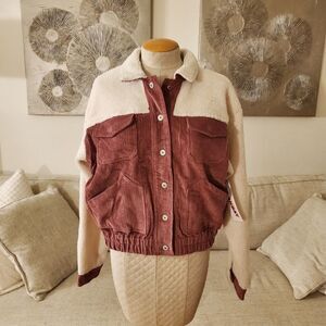 A panel of plush faux-fur spans the sleeves of this rose-hued corduroy trucker to make it feel extra cozy.