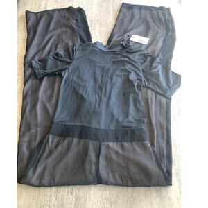 This jumpsuit is perfect if you want to try the naked dressing trend. The neckline is a mock neckline. The top is a mesh that is see-through so a nude bra or even a black bra for a trendy look. The top has a little stretch. It is short sleeve and has a hidden back zipper closure. The waist down is a wide-leg cut with a black flowy overlay that has a nude lining underneath. This piece is simple but sophisticated and chic. It gives minimalist goth vibes. New with tags.