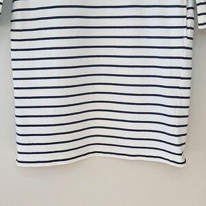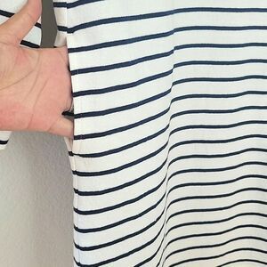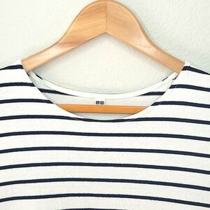 Casual, long sleeve, mini dress made by Uniqlo in size Small. Classic black and white horizontal stripes with a rounded neckline and hand pockets. 100% Cotton is comfortable and has some stretch. It hits between mid-thigh and the knees but please see measurements below to help ensure a proper fit! This simple dress can be worn on its own or pair it with a scarf, boots, and leggings/tights for a stylish Fall look. It also looks great with a jeans jacket. Perfect for any casual occasion or to simply be comfortable around the house. Minor fuzziness throughout from normal wash and wear. There is also a small mark on the left chest and another closer to the stomach area (last two pictures). Otherwise, in GUC with no holes or snags. Bundle with other items for the best deal!