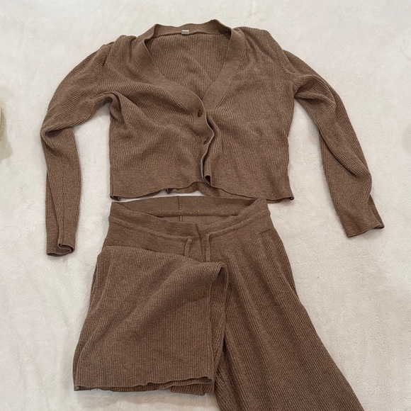 Cozy ribbed knit set. Includes cardigan and pants. Soft and comfortable.