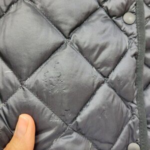 Uniqlo lightweight quilted long coat jacket in black. This versatile outerwear piece offers durable water repellency and a comfortable, packable design. The diamond quilting provides a stylish look and even warmth distribution, while the collarless neckline adds a modern touch. Two functional pockets are located on the interior. Perfect for travel, everyday errands, or layering for added warmth during transitional weather. Snap front closure.