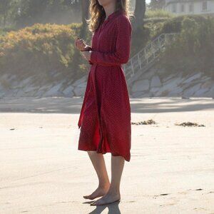 Uniqlo Dress Womens Sz XS Red and White Dots Midi Long Sleeve Button Front Shirt. Good pre-owned condition (missing belt).