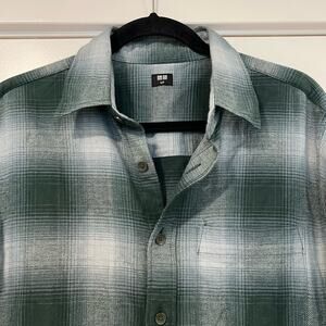 All orders ship within 1-3 business days. This longsleeve flannel short is made by Uniqlo. Color is green and blue. Size is small. Excellent condition. Fabric is 100% cotton. Make me an offer!