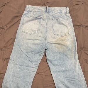 Chic light blue wide leg flare jeans. Perfect for a trendy look. Has some slight stains from green tea spill. Could be fun to bleach and dye! Thinner fabric for hot weather fit high waisted.