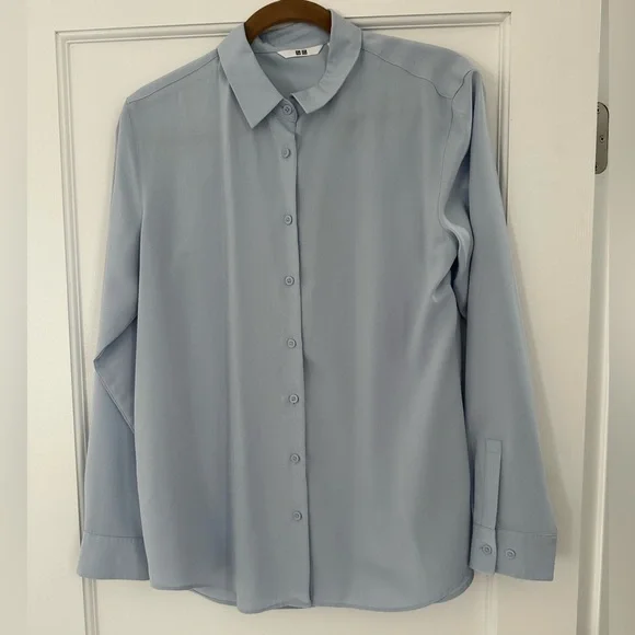 The Uniqlo blue button-down blouse is a must-have for your wardrobe. It's super comfy and breathable, with a casual button-down collar that makes it perfect for both work and play. Plus, the relaxed fit means you'll feel great all day long. It's easy to care for too—just toss it in the washing machine! Whether you layer it or wear it solo, this blouse will give you a chic and elegant look. 💙