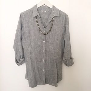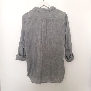 100% linen dark blue & white pin stripe button down shirt with curved hem. Only worn a couple of times, excellent condition.