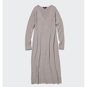 NWT Uniqlo Merino Wool Blend Fitted V-Neck Long-Sleeve Dress in Gray