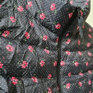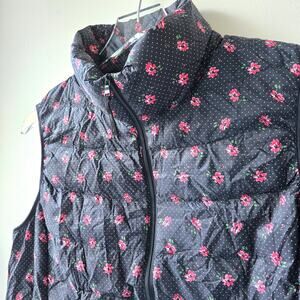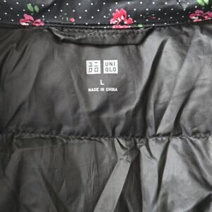 Uniqlo Ultralight Pufftech down puffer floral vest. Black with tiny white polka dots and red flower pattern. Extremely lightweight, not-too puffy, packable vest with matching stuff sack.
