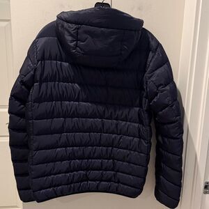 Sleek navy blue jacket with ultra light down. Ideal for chilly days.