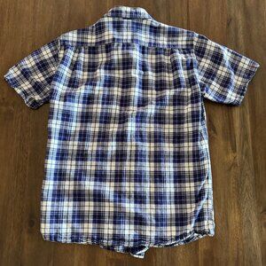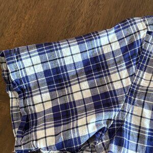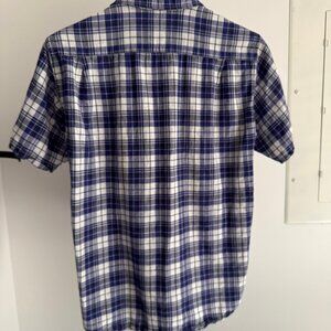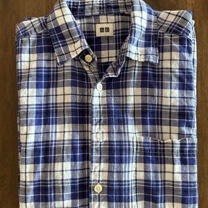 Blue/Purple plaid shirt from Uniqlo. Pointed Collar. 65% Cotton/35% Linen. Very comfortable, cool wearing shirt. This item is in excellent condition. No stains, no tears, no fading, no blemishes, no thin spots, no pit stains, no wear marks.