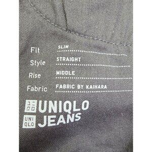 The product is a pair of Uniqlo women's jeans in size 28X27, made with Kaihara fabric and featuring a slim straight mid rise fit. These denim jeans offer a solid blue color with a dark wash, and are accented with buttons. They have a 5-pocket design and a coin pocket, with a 27-inch inseam and a slimming feature. The jeans are machine washable and made of a blend of spandex and cotton, offering comfort and style for all seasons. The Uniqlo brand ensures quality and a city-themed vibe to the clothing.
