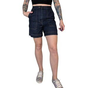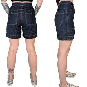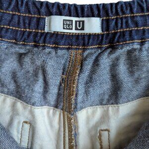 Uniqlo U Relaxed Denim Shorts in a dark wash. High-waisted with elastic in the back half of the waistband. Drawstring tie as well as zipper and button fly. Hip pockets as well as rear pockets with button closure. Size extra small.