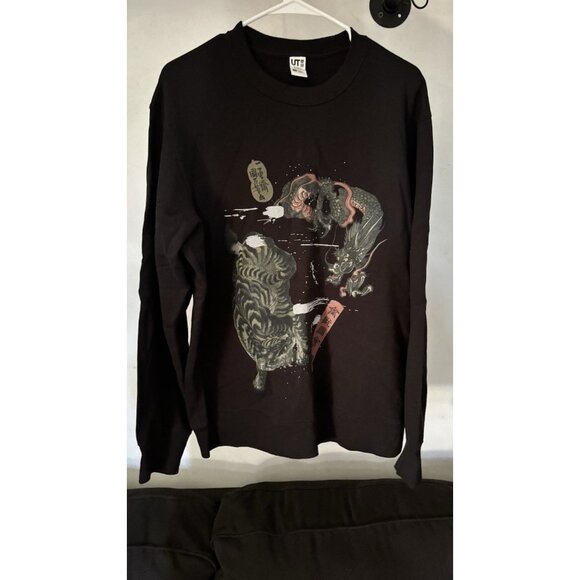 Elevate your casual style with this stylish black sweatshirt from Uniqlo. This pullover features a unique Ukiyo-e design that showcases the beauty of traditional Japanese art. It is made of high-quality materials that ensure comfort and durability, making it the perfect addition to your everyday wardrobe.