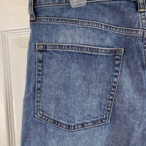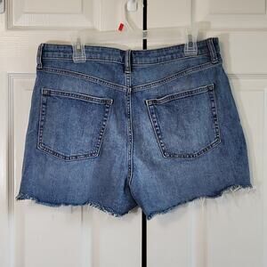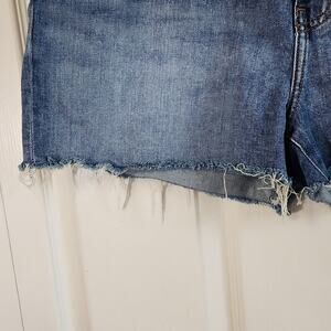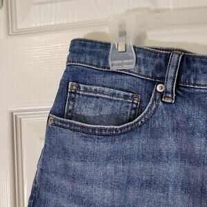 Uniqlo Womens Med Wash Distressed Cutoff Jean Shorts SZ 35 Zip & Button Raw Hem