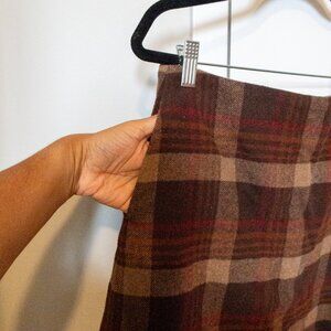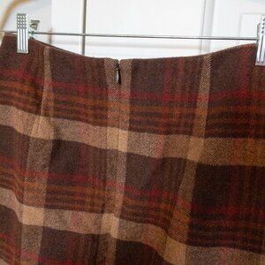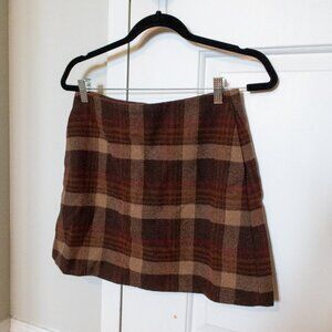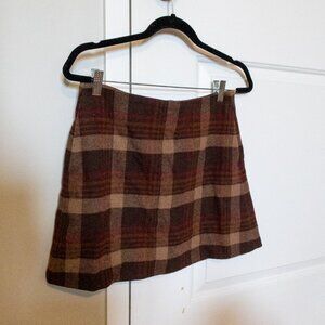 Wool blend plaid mini skirt in shades of brown/tan/orange
