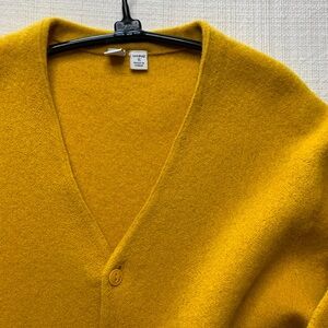 Vibrant yellow wool cardigan by Uniqlo. Soft fabric with button closure. Perfect for layering.