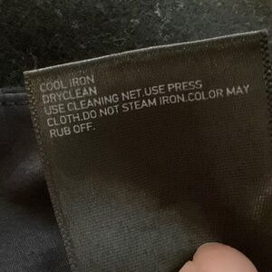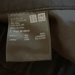 10% cashmere, 90% wool with polyester lining, size large/30-32” waist. From UniqloxLemaire 2015 collection. Button on back pocket popped off leaving small hole, see photos.