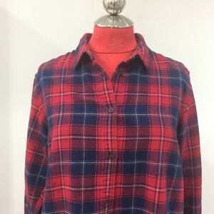 Uniqlo ladies size L red & blue plaid button front blouse. Relaxed classic style with button collar and cuffs. 100% cotton flannel is perfect for everyday wear. This blouse is gently worn - no damage or flaws.