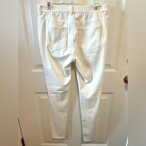 Cotten/Poly/spandex. Two back pockets, pull on style with elastic waistband. Soft and comfortable.