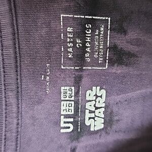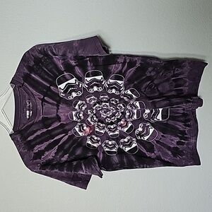 Missing size but it measures like an XL. Purple and black tie dye with a little bit pink bleach spots. There are some holes in the back at the bottom, see close up. Storm troopers go in a circle on the front of the shirt. master of graphics line Tetsu Nishiyama.